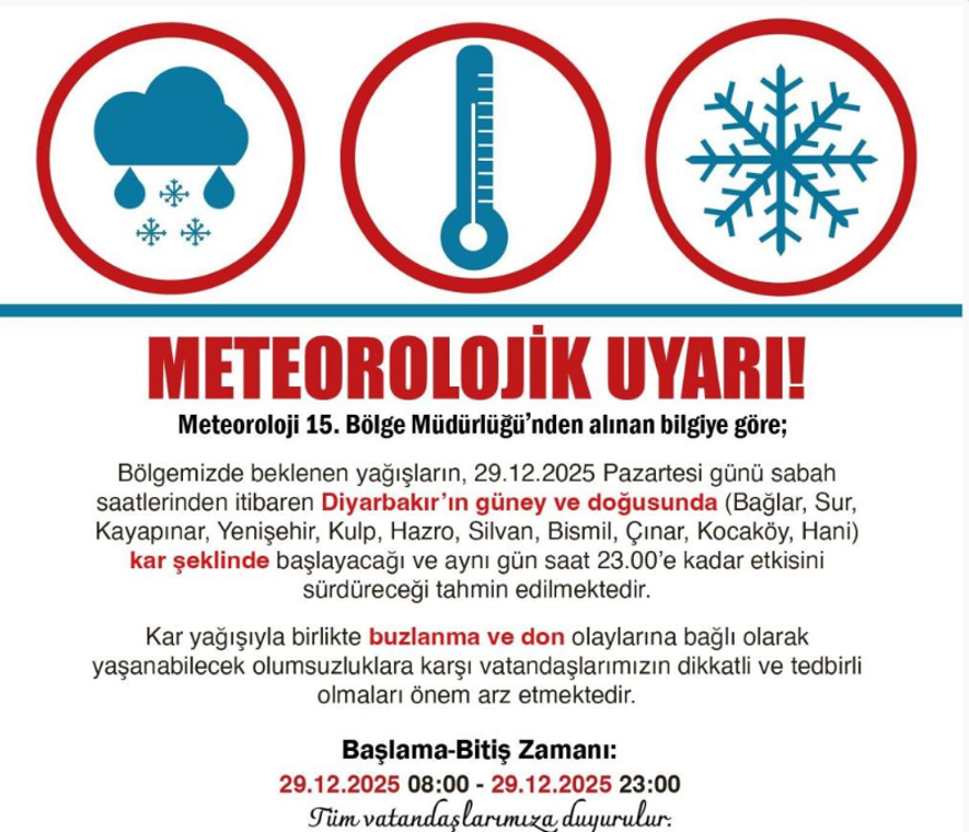 Meteoroloji 15’inci Bölge Müdürlüğünden alınan bilgiye göre, yarın Diyarbakır’ın Bağlar, Sur, Kayapınar, Yenişehir, Kulp, Hazro, Silvan, Bismil, Çınar, Kocaköy ve Hani ilçelerinde kar yağışının etkili olacak. Diyarbakır Valiliği, kar yağışıyla birlikte buzlanma ve don olaylarına bağlı olarak yaşanabilecek olumsuzluklara karşı vatandaşları dikkatli ve tedbirli olmaları konusunda uyardı.