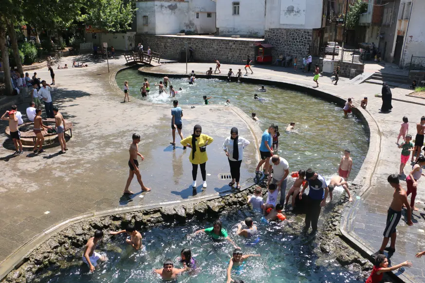 Sıcaklıktan bunalan çocuklar ise, tarihi Sur ilçesindeki Anzele süs havuzuna girerek serinliyor.