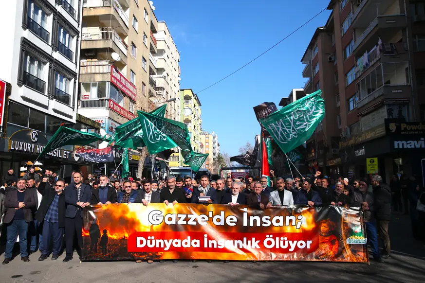 Diyarbakır'ın merkez Yenişehir ilçesinde Peygamber Sevdalıları Vakfı öncülüğünde toplanan grup, İsrail karşıtı slogan attı, sık sık tekbir getirdi.