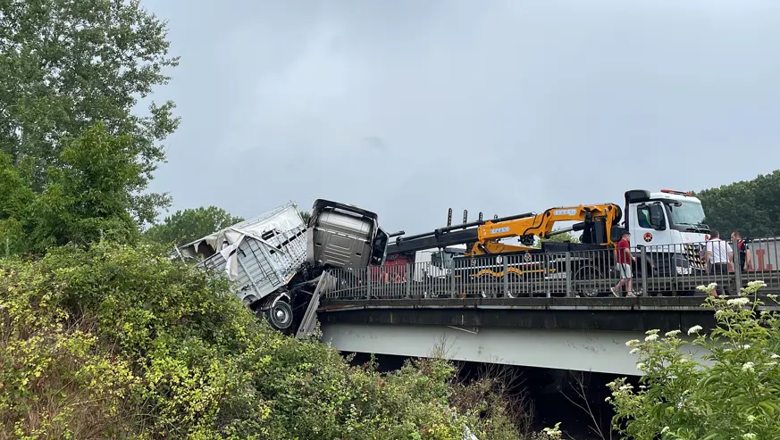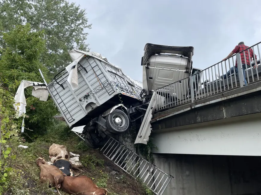Otoyolda kontrolden çıkan büyükbaş hayvan yüklü tır bariyerlerde asılı kaldı: Dorseden düşen 6 hayvan telef oldu