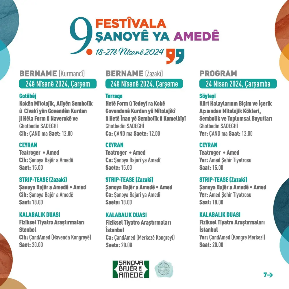 Festival boyunca, Buka Lekî (Şermola Performans), Afet İle Diana (BGST), Salma (Koma Hawar), Derwêş yan Gudû (Duhok), Efsaneya Hespên Azad (Urmiye), Kabil û Habîl (Koma Ritiûel), Odip ( Koma Ronya –Seqiz), Kral û Travîs (ŞanoAr), Çînur (Teatra Ba), Zîd û Han (Dubare Kumpanya), Mirina Jeanne D’arce ya din (Şanoya Bajarê Amed), Ceyran (Teatroger), Strip-Tease (Dimilki- Şanoya Bajarê Amed), Kalabalık Tiyatrosu (Fiziksel Tiyatro Araştırmaları), Bernarda (Tiyatro Proje No2), İnfaz (Şaneşin Performans), Otopsi (Gölge Tiyatro Topluluğu), Gomidas (Yolcu Tiyatro) ve Rîuelîstîk Playroots oyunları seyirciyle buluşacak.