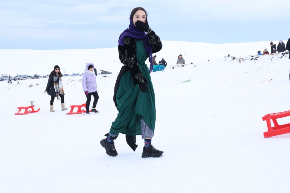 Günün erken saatlerinde merkeze gelen ziyaretçilerden yöre halkı şalvar ve fistanlarını giyerek hem kayak keyfi yapıyor hem de temiz havada mangal yakarak gönüllerince eğlenip halay çekiyor.