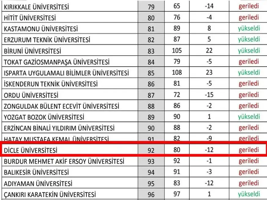 Her yıl Türkiye'deki üniversitelerin başarı ortalamalarını hesaplayıp bilimsel verilerle üniversiteler arası başarı sıralaması yayınlayan ve bu verileri tüm üniversitelerce kabul gören URAP'ın 2023-2024 Türkiye sıralamasında, Dicle Üniversitesi, bir yılda 12 sıra birden gerileyip 92. sırada yer aldı.
