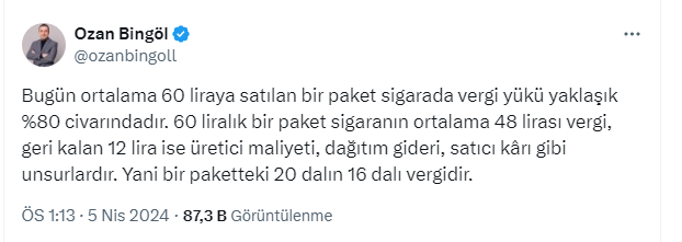 Ozan Bingöl’ün konuyla ilgili paylaşımı şöyle: “Bugün ortalama 60 liraya satılan bir paket sigarada vergi yükü yaklaşık % 80 civarındadır.