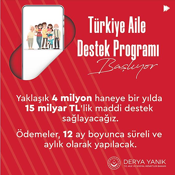 Cumhurbaşkanı Erdoğan'ın Kabine Toplantısı sonrası 15 milyar liralık ilave bütçeye sahip olan Aile Destek Programı'nın ilk ödemesinin temmuz ayında yapılacağını duyurması sonrası Aile ve Sosyal Hizmetler Bakanı Derya Yanık konu hakkında açıklama yaptı.
