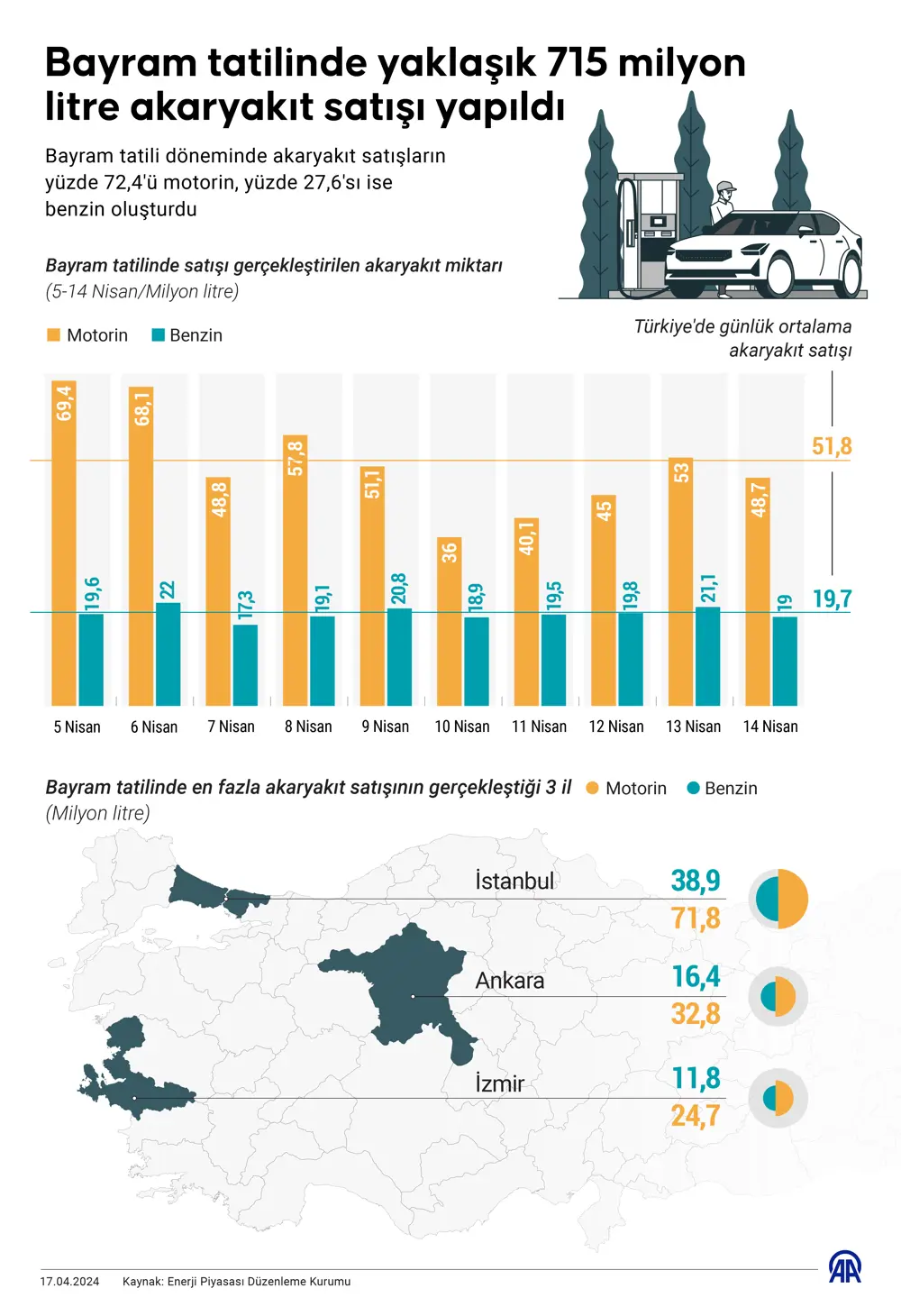 Bayram tatili döneminde akaryakıt satışların yüzde 72,4'ü motorin, yüzde 27,6'sı ise benzin oluşturdu. Bu satış en fazla 5-14 Nisan tarihleri arasında oldu.