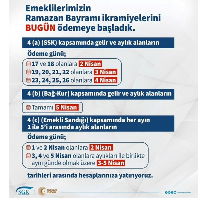 Bayram ikramiyeleri, SSK kapsamında emekli olanlara 2, 3 ve 4 Nisan, Bağ-Kur'dan emekli olanlara 5 Nisan, Emekli Sandığı kapsamındakilere ise 2, 3 ve 5 Nisan'da ödenecek.