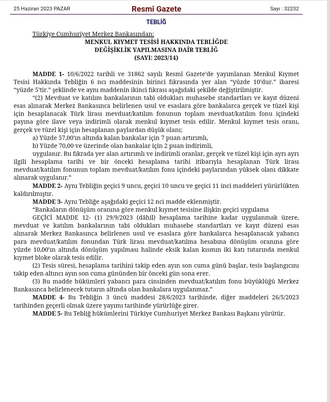 Resmi Gazete’de yayımlanan tebliğle menkul kıymet tesisi oranı kapsamında bilançolarda öngörülen TL ağırlığı yüzde 60’dan yüzde 57’ye çekildi.