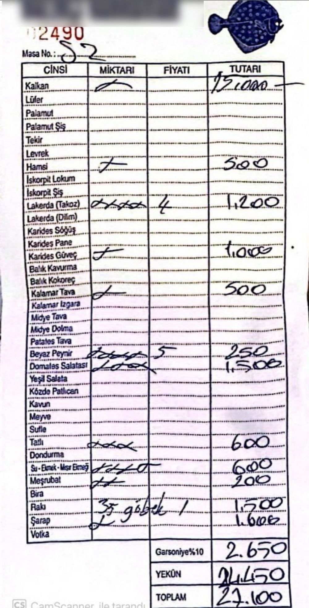 Balık lokantasında 6 kişilik masaya gelen 27 bin 100 liralık adisyon sosyal medyada gündem oldu
