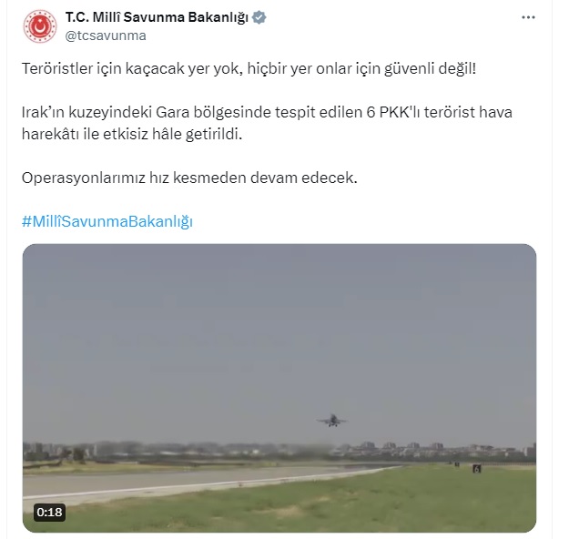 “Teröristler için kaçacak yer yok, hiçbir yer onlar için güvenli değil. Irak’ın kuzeyindeki Gara bölgesinde tespit edilen 6 PKK’lı terörist hava harekâtı ile etkisiz hale getirildi. Operasyonlarımız hız kesmeden devam edecek.”