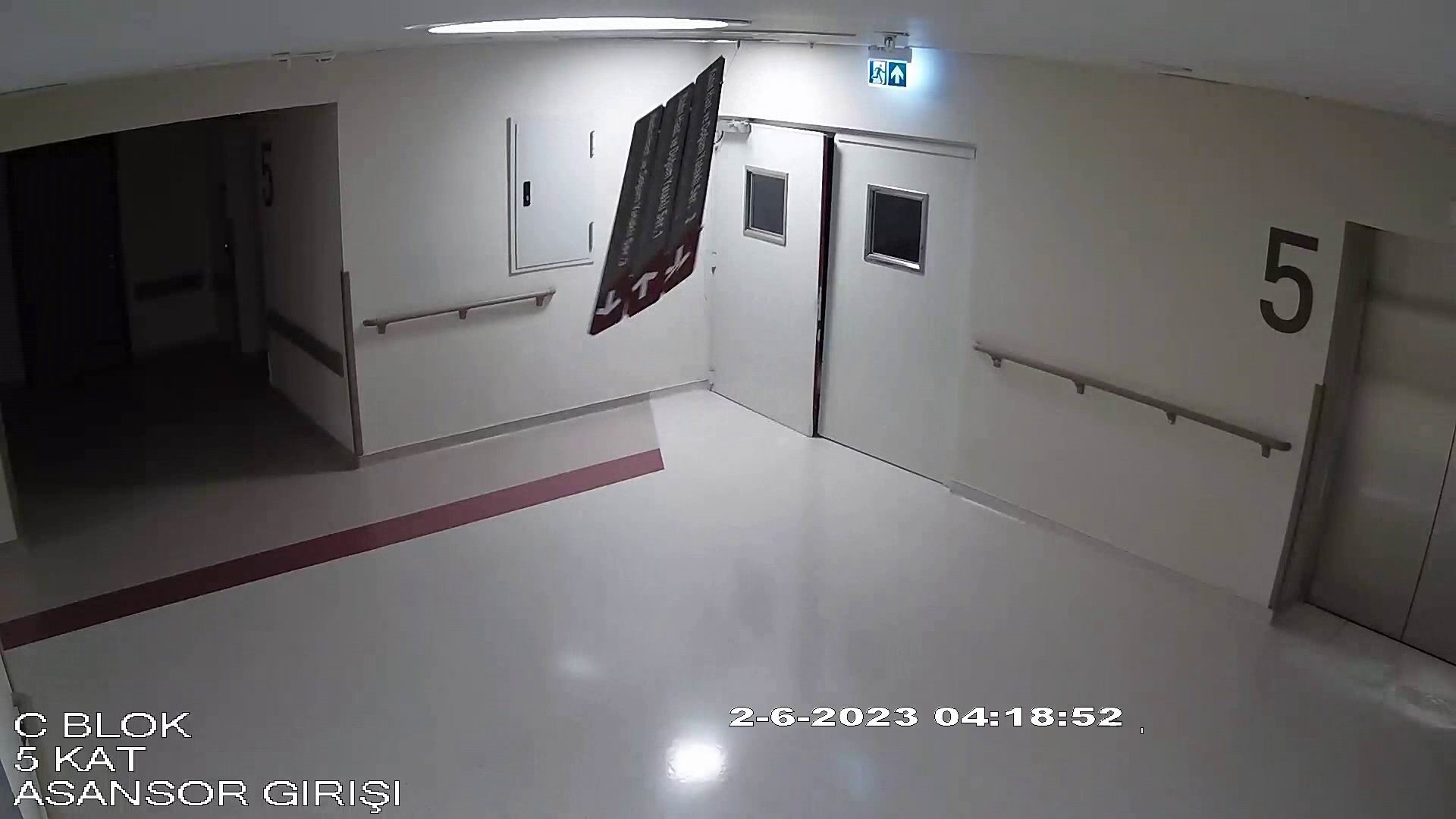 Hastanenin C blok poliklinik girişinde saat 13.26’da kaydedilen görüntülerde, depremi hisseden vatandaşların mahşeri kalabalıktan kaçışları kayıt altına alındı. Gece saat 04.17’de kaydedilen görüntülerde ise C blok 5. katta bulunan asansör bölümü depremin şiddetini adeta gözler önüne serdi. 872 deprem izolatörün bulunduğu hastanede 7,8 büyüklüğündeki deprem nedeni ile kapılar açılıp kapanmaya başlarken, demir teller tutulan yön tabelaları sarsıntıya dayanamayarak koptuğu görülüyor.
