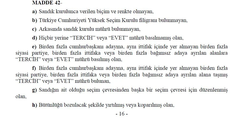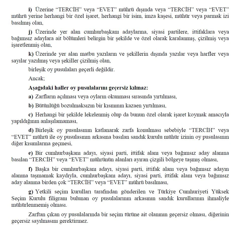 e) "Bir cumhurbaşkanı adayı, siyasi parti, ittifak alanı veya bağımsız aday alanına basılan "TERCİH" veya "EVET" mührünün alanları ayıran çizgili bölgeye taşmış olması" oy pusulalarını geçersiz kılmaz.