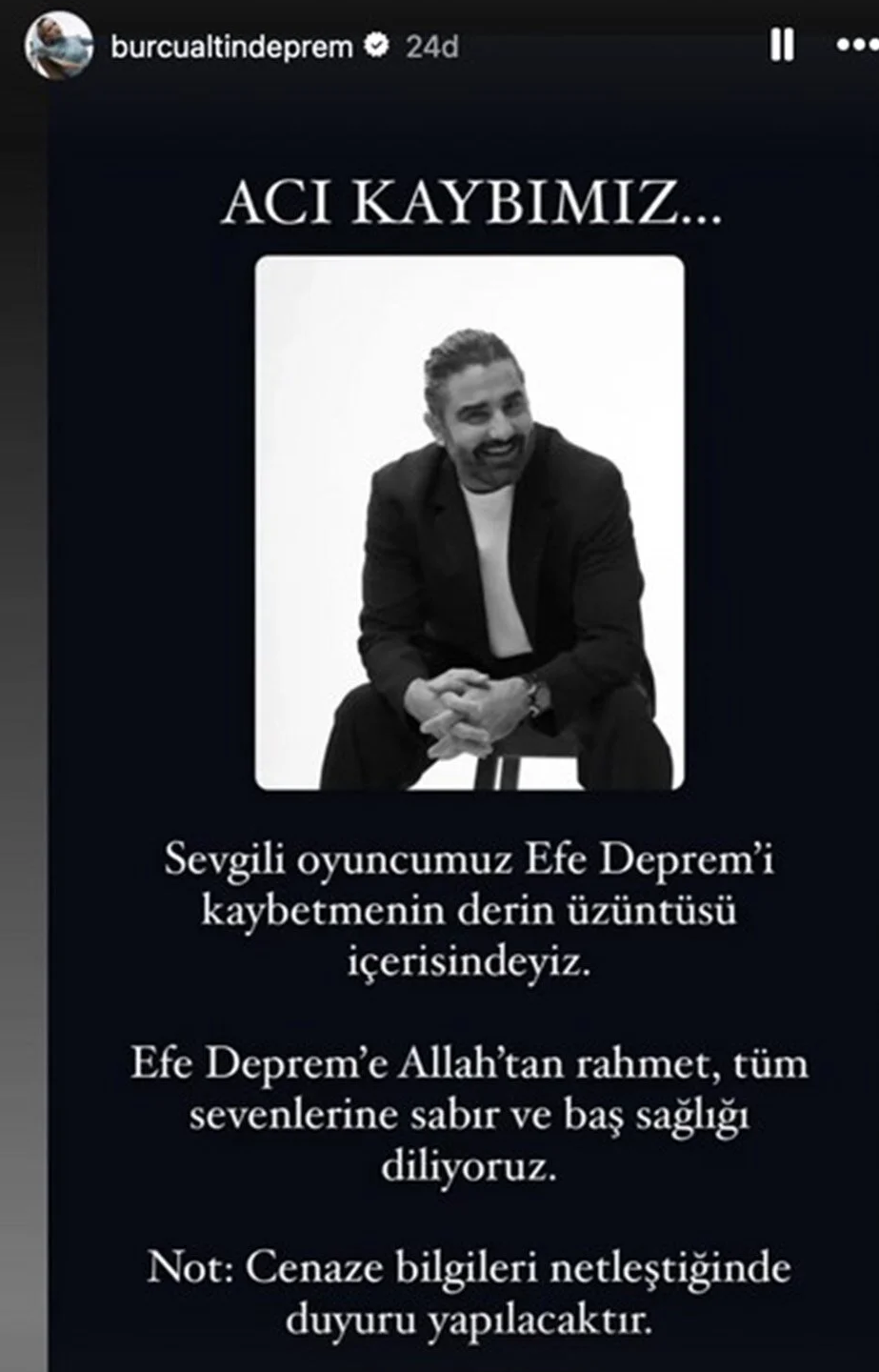 Oyuncunun eşi Burcu Altın Deprem sosyal medya hesabında acı haberi duyurdu.