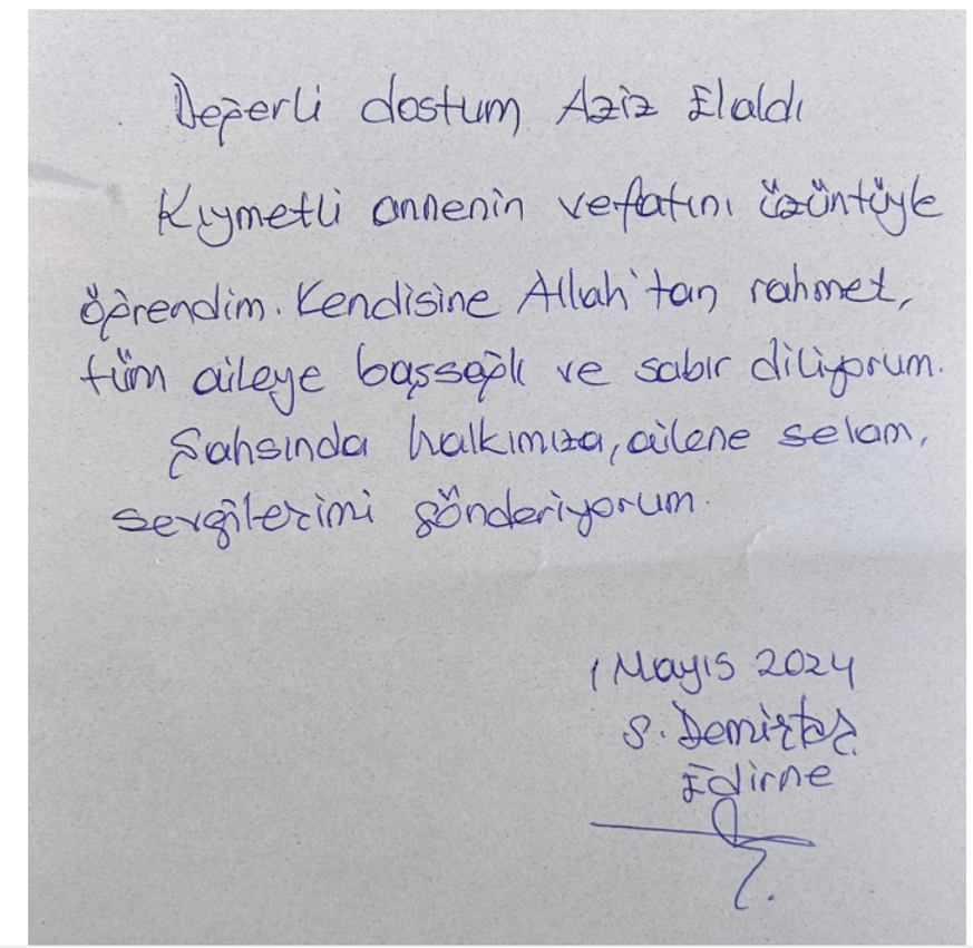 Aziz Elaldı’nın annesi Sürme Elaldı Salı günü hayatını kaybetmişti. Edirne de tutuklu bulunan Selahattin Demirtaş Aziz Eladı’ya cezaevinde yolladığı mektupla baş sağlığı diledi.