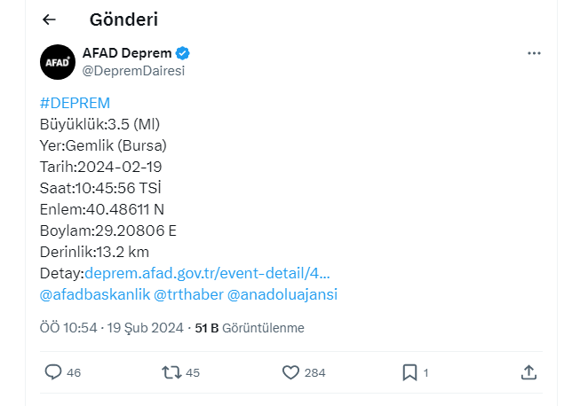 AFAD Bursa Gemlik merkezli gerçekleşen depremin şiddetini 3.5 olarak açıkladı. Kandilli Rasathanesi de Gemlik merkezli 3.5 büyüklüğünde bir depremin gerçekleştiğini duyurdu.