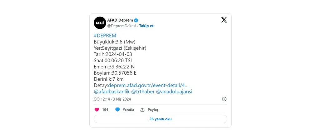 AFAD, Eskişehir'de 00.06'da merkez üssü Eskişehir'in Seyitgazi ilçesinde 3.6 büyüklüğünde bir deprem meydana geldiğini duyurdu.