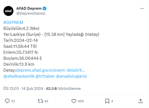 AFAD, saat 11.56 sıralarında merkez üssü Suriye'nin Lazkiye kenti olan 4,2 büyüklüğünde bir deprem olduğunu duyurdu.