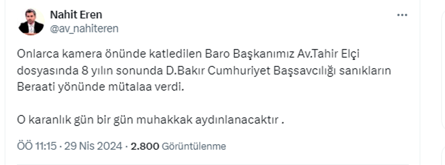 Diyarbakır Baro Başkanı Nahit Eren, sosyal medya hesabından yaptığı açıklamada, "Onlarca kamera önünde katledilen Baro Başkanımız Av.Tahir Elçi dosyasında 8 yılın sonunda D.Bakır Cumhuriyet Başsavcılığı sanıkların Beraatı yönünde mütalaa verdi.