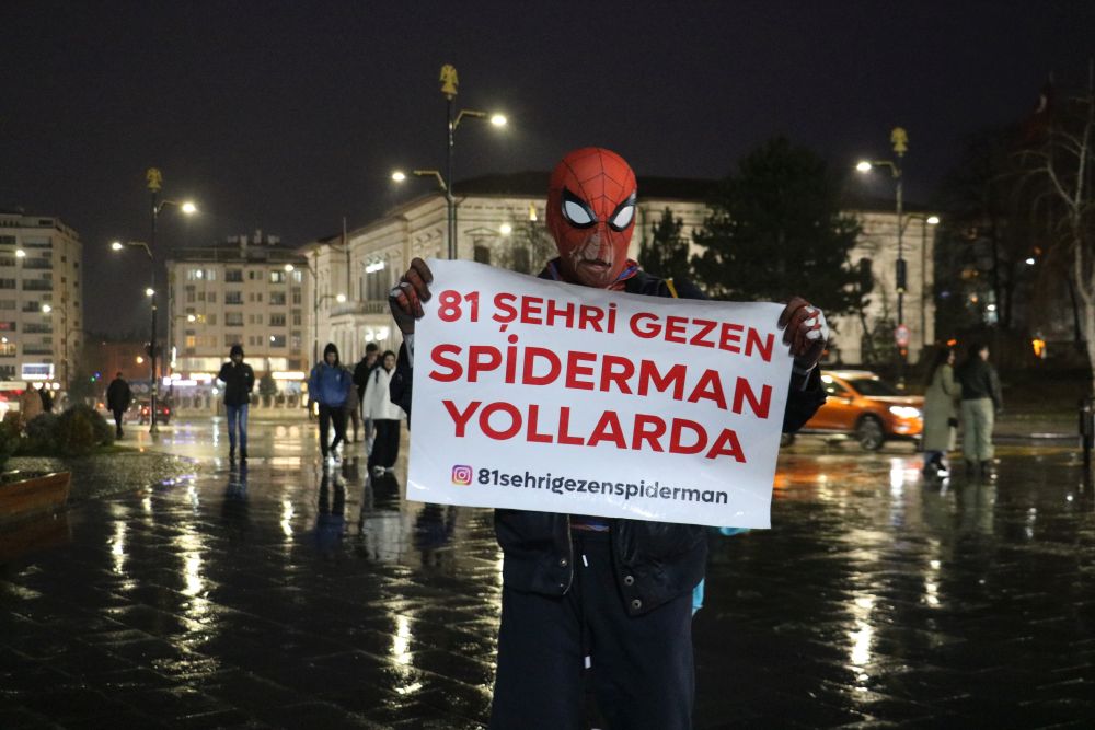 81 il gezi programının beşinci durağı olan Sivas'a geldi. Tarihi kent meydanında vatandaşlarla fotoğraf çektiren yerli örümcek adam, yoğun ilgi gördü. Uzun saatler tarihi kent meydanında bekleyen yerli örümcek adam Sivas'ın soğuk havasına yenik düştü. Soğuk havaya dayanamayan yerli örümcek adam üzerine mont giyerek vatandaşlarla fotoğraf çektirmek zorunda kaldı. Sivas'ta soğuk havaya yenik düşen yeli örümcek adamın bir sonraki durağı Diyarbakır olacak.
