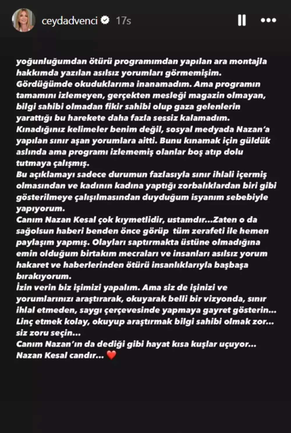 Ceyda Düvenci, Bambaşka Sohbetler programıyla izleyicilerin karşısına her hafta farklı ünlü isimleri çıkarıyor. Bu hafta ise usta oyuncu Nazan Kesal, programın konuğu oldu. Ancak, programın sonunda yapılan bir konuşma sosyal medyada büyük yankı uyandırdı.
