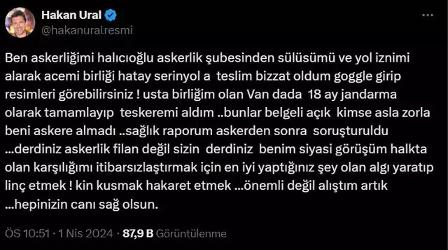 Hakan Ural, Özgür Demirtaş'ın bu yorumlarına sosyal medya üzerinden yanıt verdi. Ural, "Ben askerliğimi Halıcıoğlu Askerlik Şubesinden sülüsümü ve yol iznimi alarak acemi birliği Hatay Serinyol'a teslim bizzat oldum." şeklinde açıklama yaparak askerlik geçmişini paylaştı. Ayrıca, "Google'a girip resimleri görebilirsiniz! Usta birliğim olan Van'da 18 ay jandarma olarak tamamlayıp teskeremi aldım. Bunlar belgeli açık, kimse asla zorla beni askere almadı." ifadeleriyle de askerlik sürecine dair belgeleri olduğunu belirtti.