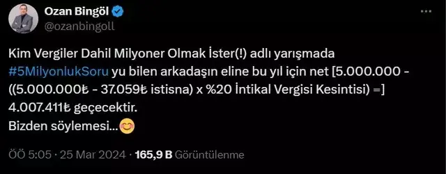Ancak her zaferin arkasında bir gerçek var: Vergiler! Vergi uzmanı Ozan Bingöl, Göktaş'ın eline geçecek olan parayı detaylı bir şekilde açıkladı. Bu hesaba göre, kesilecek istisna ve intikal vergileriyle birlikte Berk Göktaş'ın eline 4 milyon 7 bin 411 TL geçeceği belirtildi. Bu açıklama, zaferin ardından vergi konusunun da unutulmaması gerektiğini hatırlatıyor.