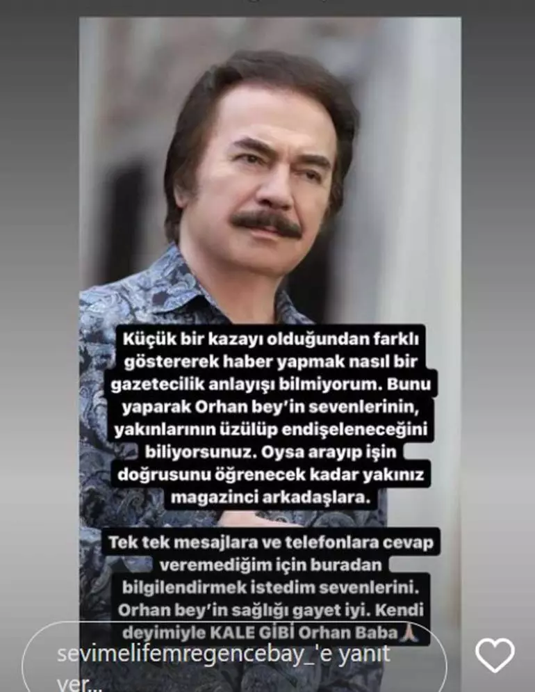 Teknenin kenarında duruyorduk. Orhan Bey inmek istedi ve acele etti sanırım. Teknedeki kişi elini uzattı. Direkt betona çakıldı. Allah'tan tekne yanaşmıştı. Başını çarpabilirdi. Spor yaptığı için daha hafif atlattı. Vücudunda çürükler oldu, korse verdiler. 3-4 gün sonra tamamen normale döneceğini söyledi doktorlar. Yalan yanlış Haberler yapılıyor, bunlar bizi çok üzüyor...