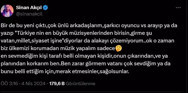 Murat Kurum'un seçim kampanyası için bestelediği şarkıyla gündeme gelen Sinan Akçıl, siyasete dair bakış açısını sık sık sosyal medya üzerinden paylaşıyor. Akçıl'ın son paylaşımı da bu konuda öne çıkanlardan biri oldu. Kendisinin de siyasete dair düşüncelerini samimi bir şekilde dile getirdiği bu paylaşımıyla Akçıl, takipçilerinin ilgisini bir kez daha üzerine çekti.