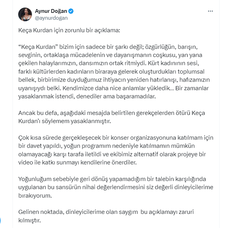 - Keça Kurdan şarkısının Aynur tarafından ne studioda ne de sahnede bugünden itibaren yorumlanmasına izin vermiyoruz.