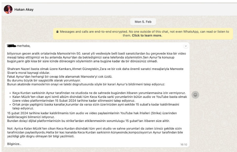 "Merhaba, biliyorsun geçen Aralık ortalarında Mamoste'nin 50. sanat yılı vesilesiyle belli başlı sanatçılardan bu çerçevede kısa bir video mesajı talep etttigimizi ve bu anlamda Aynur'dan da bekledigimizi sana telefonda söylemiştim.