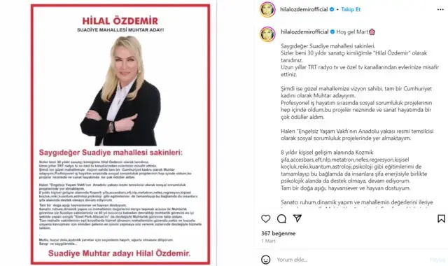 Hilal Özdemir'in muhtarlık adaylığını duyurduğu sosyal medya paylaşımı, büyük bir ilgiyle karşılandı. Özdemir, uzun yıllardır tanındığı sanat camiasının yanı sıra, Suadiye Mahallesi sakinlerine hitap ederek adaylığını açıkladı. Bu açıklama, toplumda çeşitli tepkilere yol açtı.