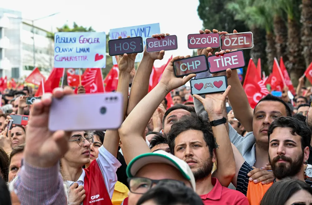 CHP Genel Başkanı Özgür Özel (ortada), hava yoluyla geldiği İzmir'de Adnan Menderes Havalimanı önünde kendisini bekleyen vatandaşlara otobüs üzerinden seslendi. Özel'e CHP Genel Başkan Yardımcısı ve Parti Sözcüsü Deniz Yücel ile İzmir ve Manisa'dan seçilen belediye başkanları ve bazı milletvekilleri de eşlik etti.