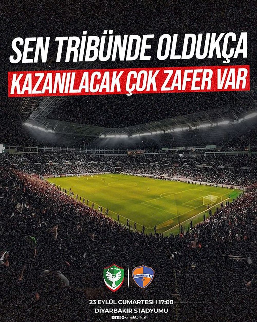Bu sezon kendi sahasındaki ilk 2 maçta 20 bin taraftar ortalamasıyla oynayan Amedspor, Cumartesi günkü İskenderunspor karşılaşmasında dolu tribünleri hedefliyor.