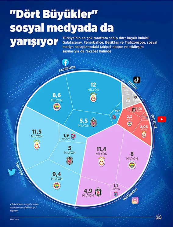 Bu kulüplerin 2022-2023 sezonu öncesi sosyal medya hesapları, takipçi sayıları ve etkileşimleri AA muhabiri tarafından istatistiki olarak derlendi.