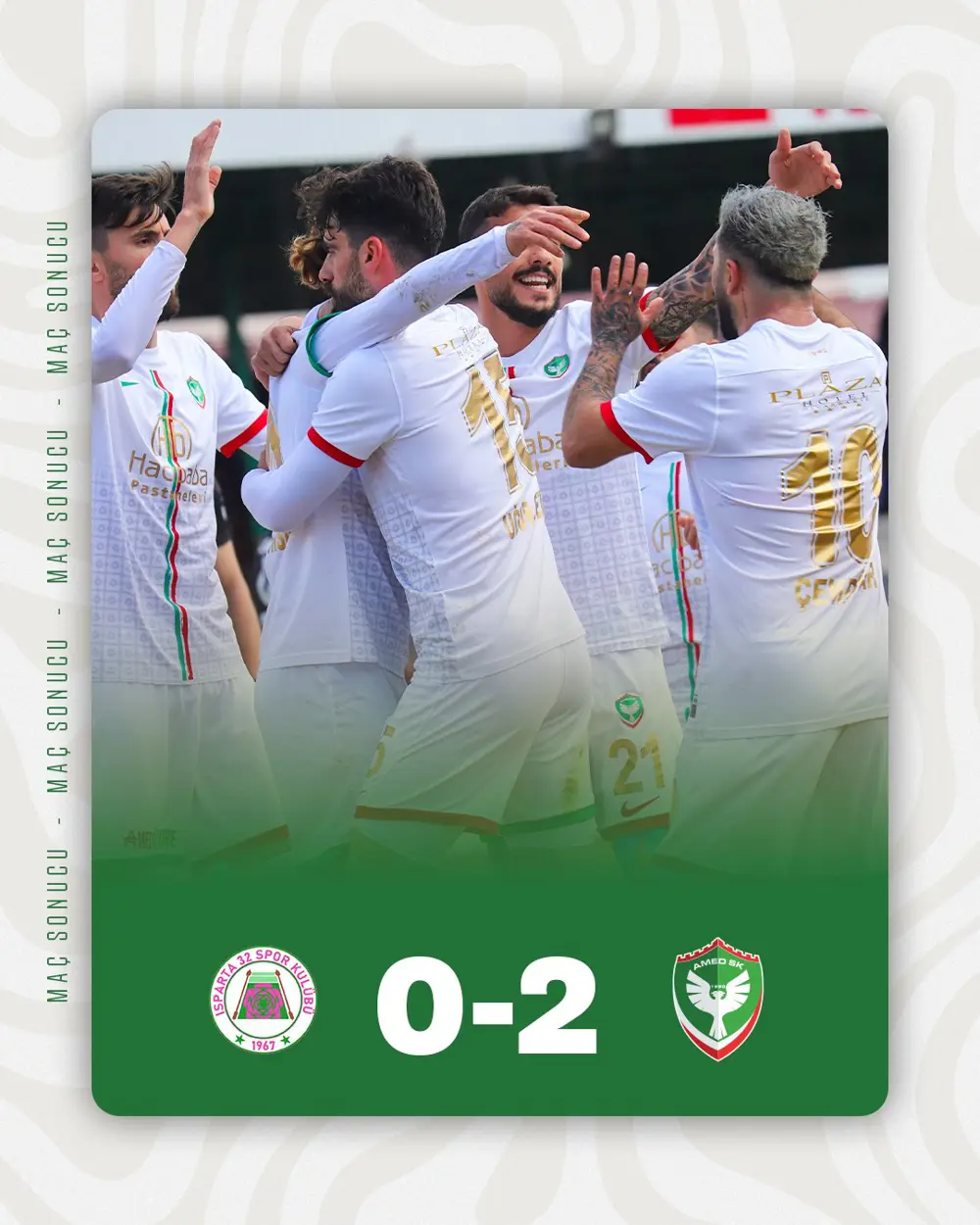 TFF 2. li kırmızı grubunun lideri Amedspor ligin 29. haftasında deplasmanda Isparta 32 Spor'a konuk oldu. Maça hızlı ve istekli başlayan Amedspor maçı ilk yarıda Berk İsmail Ünsal'ın attığı gollerle 2-0 kazanarak liderliğini sürdürdü.