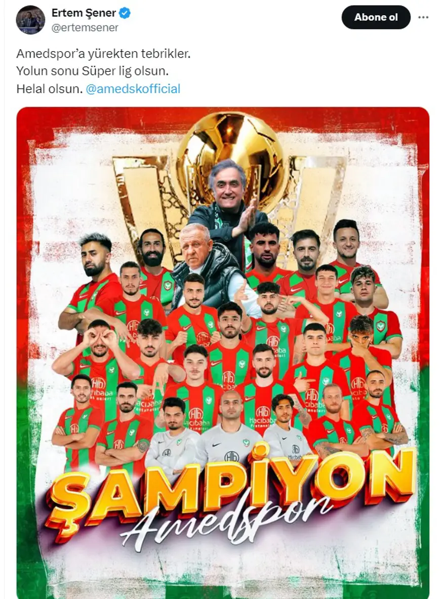 X medya hesabından paylaşımda bulunan Beyaz TV’de yayınlanan Beyaz Futbol programının moderatörü Ertem Şener paylaşımında, “Amedspor’a yürekten tebrikler. Yolun sonu Süper lig olsun. Helal olsun” ifadelerine yer verdi.