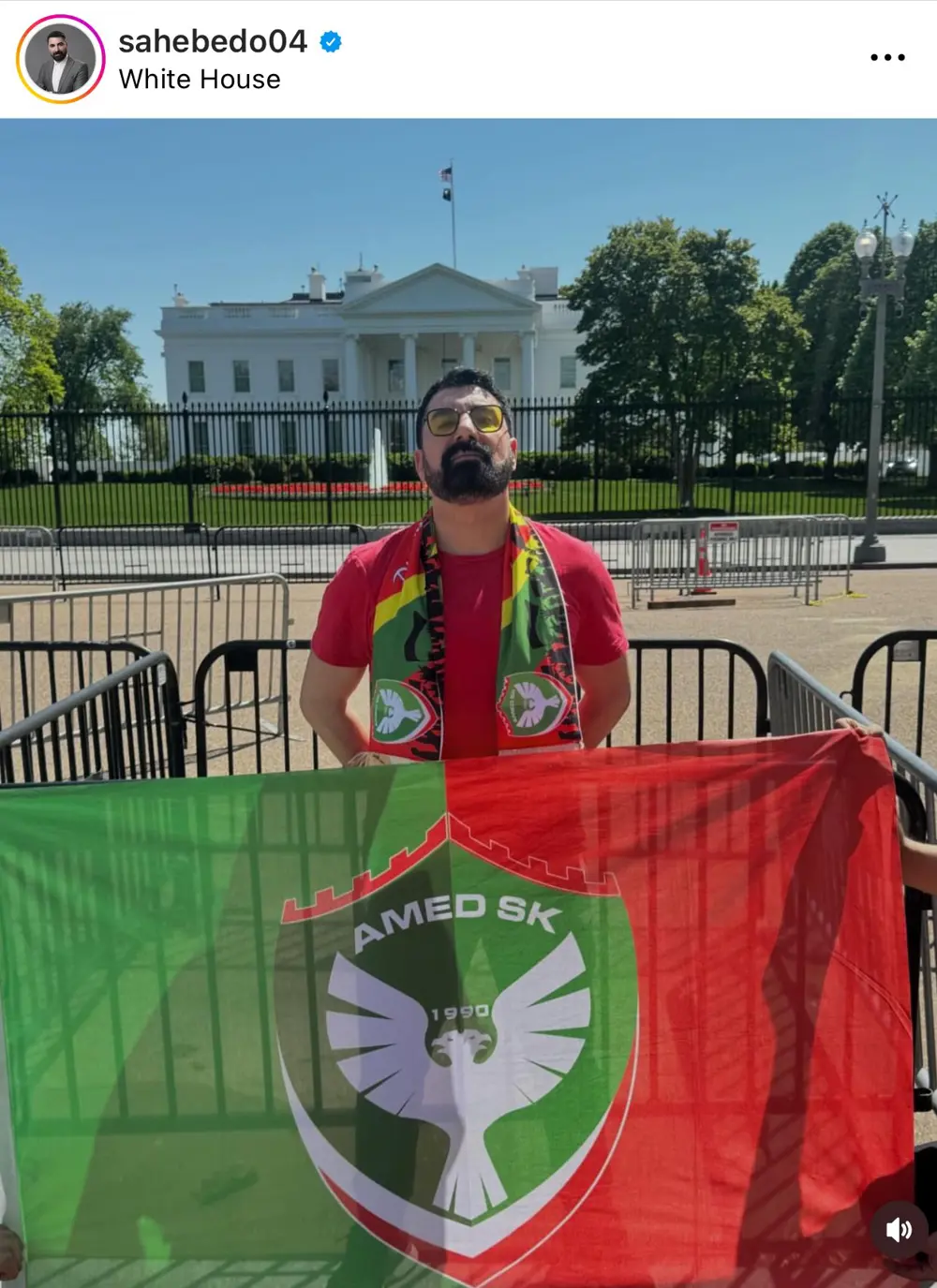 Amedspor formasını giyip, bayrağını Beyaz Saray önünde açan sanatçı, o anları sosyal medyadan şu sözlerle paylaştı: “Serkeftîn. Lî bajare Washington Slav. BÎJÎ AMEDSPOR”