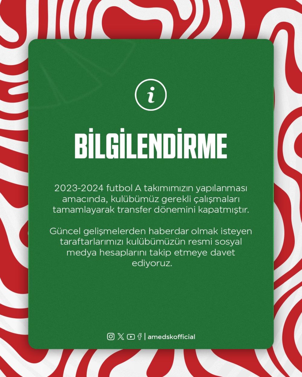 “2023-2024 futbol A takımımızın yapılanması amacında, kulübümüz gerekli çalışmaları tamamlayarak transfer dönemini kapatmıştır”