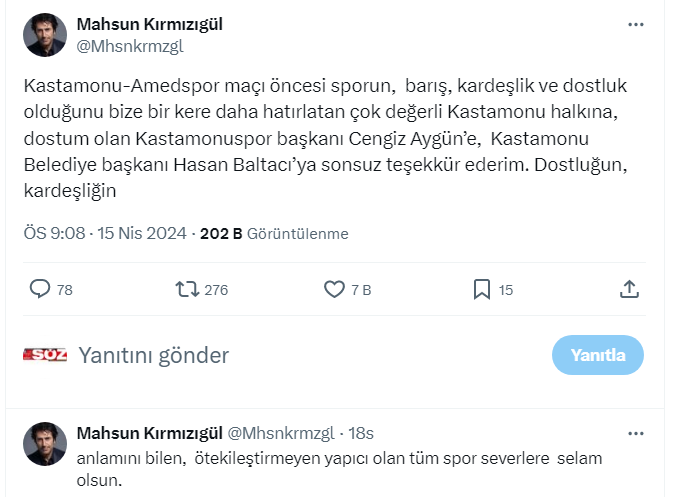 “Kastamonu-Amedspor maçı öncesi sporun, barış, kardeşlik ve dostluk olduğunu bize bir kere daha hatırlatan çok değerli Kastamonu halkına, dostum olan Kastamonuspor başkanı Cengiz Aygün’e, Kastamonu Belediye başkanı Hasan Baltacı’ya sonsuz teşekkür ederim. Dostluğun, kardeşliğin anlamını bilen, ötekileştirmeyen yapıcı olan tüm spor severlere selam olsun”
