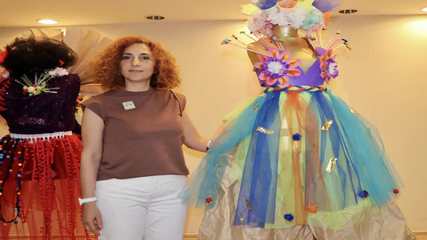 "Atık malzemeleri sanatsal bir malzeme olarak kullanıp dönüştürmek üzerine bir çalışma. Örneğin burada kağıt bardaklar, plastik kaşıklar, çatallar, ambalaj kağıtları yani aklımıza gelebilecek her türlü yan ürün ve kullanılmış ürün malzeme olarak da kullanılıyor. Tek bir malzememiz yok, genellikle çalışma yapacak arkadaşlara etrafınızda atık ne bulursanız getirin ve onlardan bu kostümleri oluşturun diyoruz. Şu an çok güzel sonuçlar çıktı."
