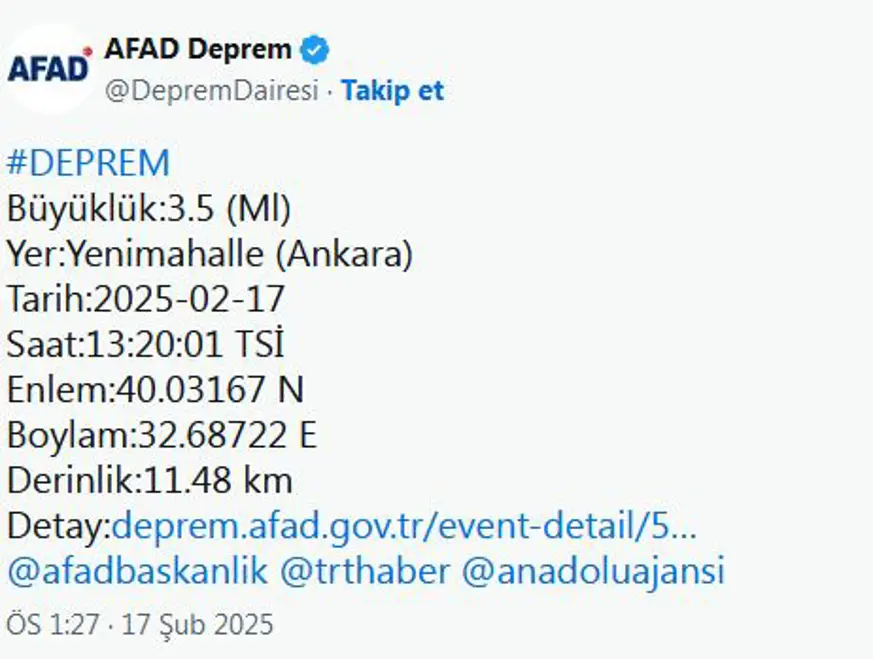 Afet ve Acil Durum Yönetimi Başkanlığının (AFAD) internet sitesinde yer alan bilgiye göre, Ankara'nın Yenimahalle ilçesinde saat 13.20'de 3,5 büyüklüğünde deprem kaydedildi.
