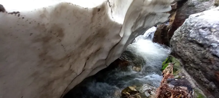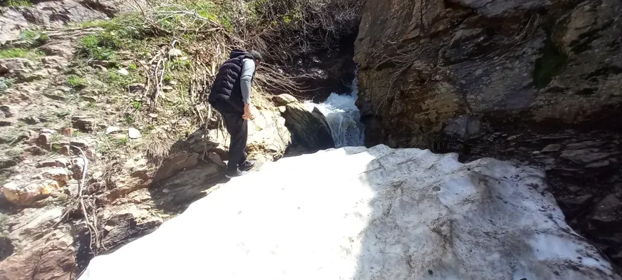 Dağlar arasındaki kar tüneli, doğal şelalenin üzerini bir köprü gibi örterek, altından berrak suların akmasına izin veriyor. Bu manzara, adeta bir doğa harikası olarak ziyaretçilerini büyülüyor.