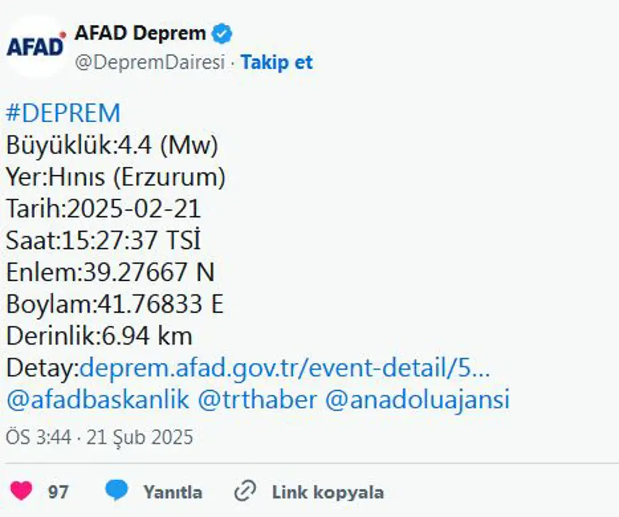 İçişleri Bakanlığı Afet ve Acil Durum Yönetimi Başkanlığı (AFAD), Erzurum'un Hınıs ilçesinde 4.4 büyüklüğünde deprem meydana geldi. Kandilli Rasathanesi'nin verilerine göre ise 4.3 büyüklüğünde deprem meydana geldi.