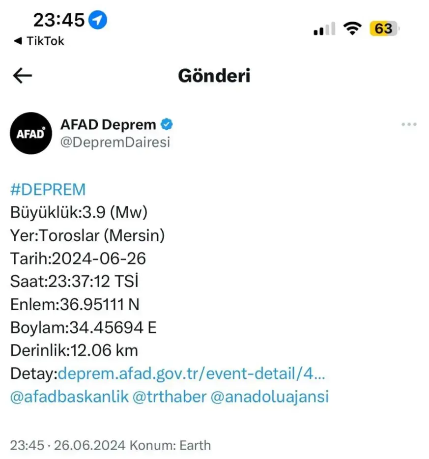 Mersin Toroslar'da 3,9 büyüklüğünde korkutan bir deprem meydana geldi. Depremi AFAD son dakika olarak duyurdu. Deprem yerin 12 kilometre derinliğinde meydana geldi.