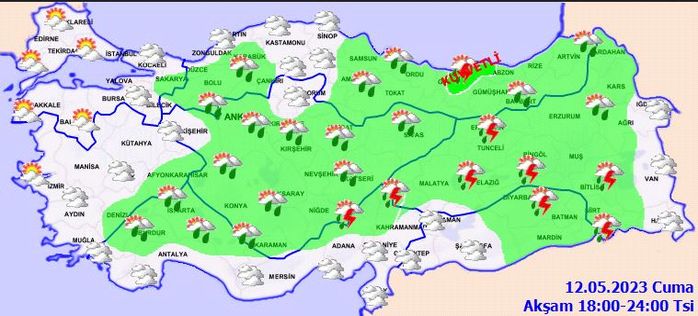 Meteoroloji Genel Müdürlüğü tarafından yapılan son değerlendirmelere göre ülkemiz genelinin parçalı ve çok bulutlu, Marmara'nın doğusu ve Balıkesir çevreleri, İç Ege ve İzmir çevreleri, Akdeniz'in iç kesimleri, İç Anadolu, Karadeniz , Doğu Anadolu ve Güney Doğu Anadolu aralıklı sağanak ve gök gürültülü sağanak yağışlı geçeceği tahmin ediliyor.