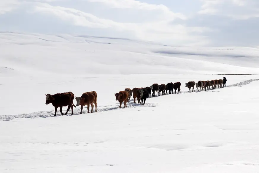 Beyaz örtüyle kaplı arazilerden geçirip derelerde su ihtiyacını karşıladıkları hayvanlarını, kar üzerinde besleyen yöre sakinleri için iklimin zorlukları mart ayında da kendini gösteriyor.