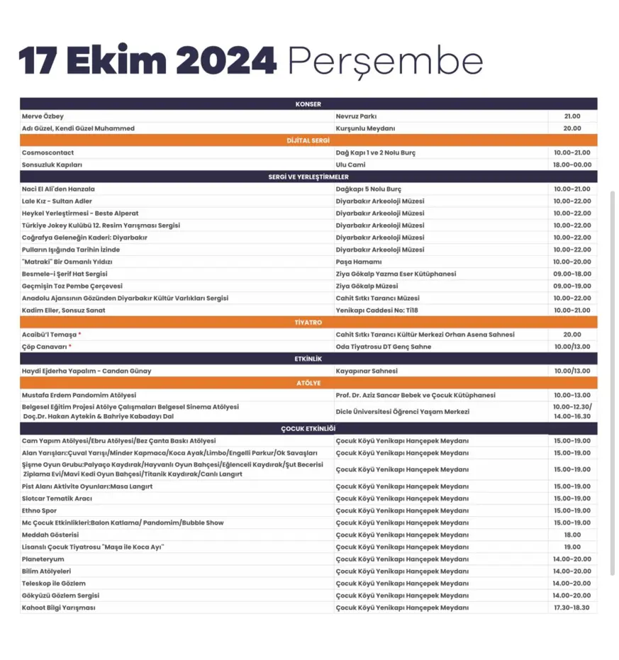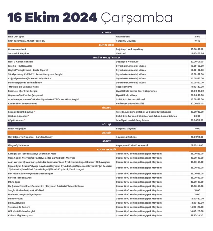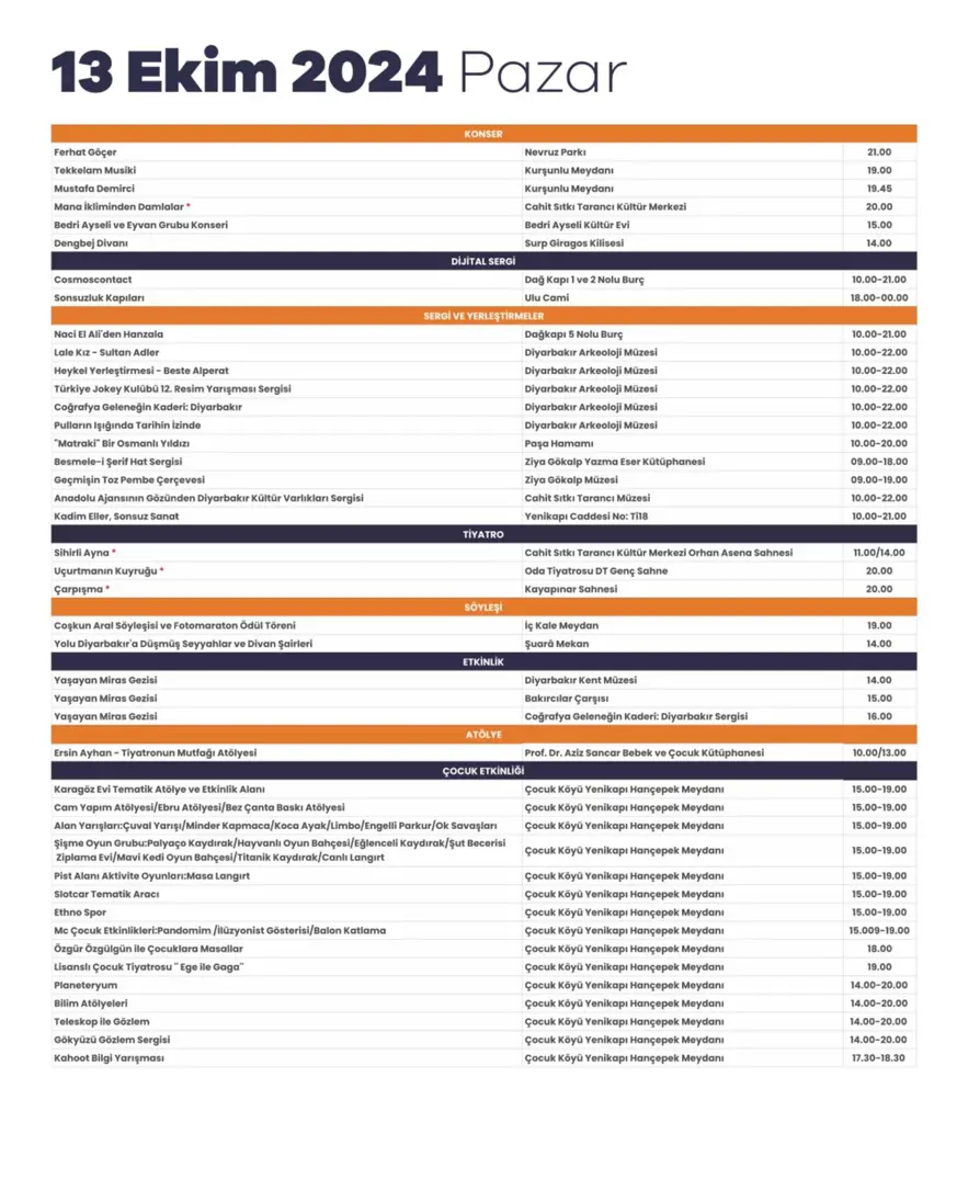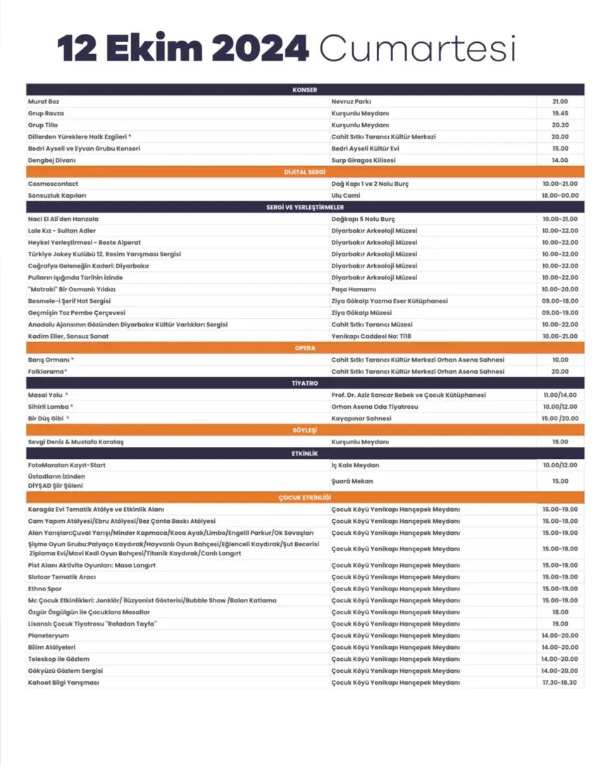 Diyarbakır, 12-20 Ekim 2024 tarihleri arasında Kültür ve Turizm Bakanlığı tarafından düzenlenen Kültür Yolu Festivali'ne ev sahipliği yapmaya hazırlanıyor. Şehrin zenginliklerinin öne çıkarılacağı festivalde, Diyarakır'ın kültürel mirası, müzik, sanat ve gastronomik özellikleri görücüye çıkacak. Diyarbakır’ın tarihi surları ve Hevsel Bahçeleri gibi UNESCO Dünya Mirası listesinde yer alan noktalar festival boyunca açık hava konserleri, tiyatro gösterileri, dans performansları ve sanat sergilerinin yer alacağı noktalar olacak.