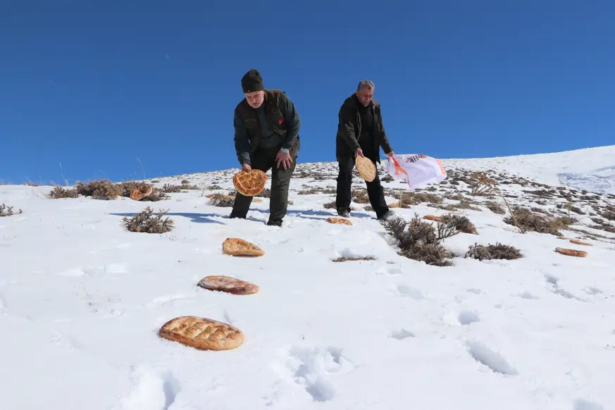 Kış şartlarından dolayı yiyecek bulmakta güçlük çeken yaban hayvanları için kar kalınlığının yer yer bir metreyi aştığı kırsal arazilere ve dağlık alanlara giden ekipler, buralara buğday, ekmek ve yem bırakıyor.