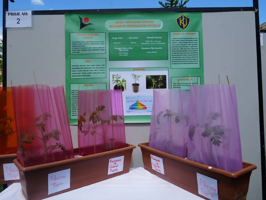 Bu çerçevede öğrenciler tarafından 14 adet saksıya domates fidesi dikildi. Saksılara dikilen fidelerin gelişimi farklı renklerdeki sera brandaları kullanılarak incelendi.1 aydan fazla süren deney neticesinde öğrenciler, deneyin ilk haftasında hayvansal gübrede yetiştirilen bitkilerin daha hızlı büyüdüğünü tespit etti. Deneyin ikinci haftasında kompost ve hayvansal gübre toprağında bitki yapraklarının daha fazla oranda arttığı görülürken, seralarda kullanılan mor renkte naylon brandanın da hem verime hem de fidenin daha hızlı gelişmesine katkı sağladığı belirlendi.
