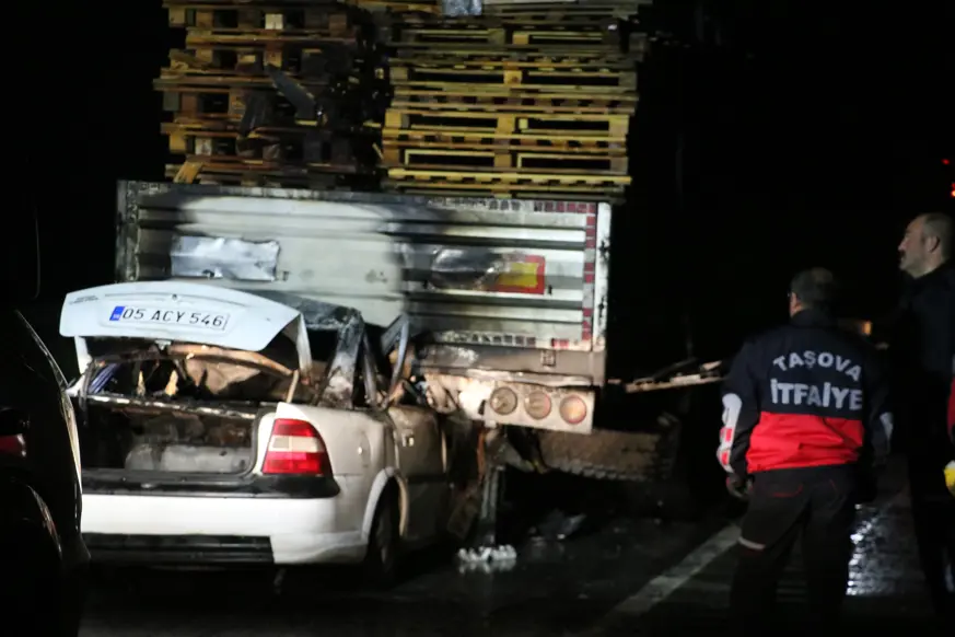 Amasya’da palet yüklü tıra arkadan ok gibi saplanan otomobil alevlere teslim oldu. Yanan otomobildeki sürücü hayatını kaybetti.